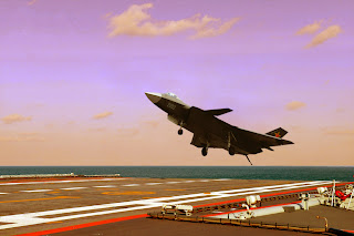 Computer-generated imagery (CGI) of Chinese J-31 Shen Fei (Falcon Eagle) Fifth Generation Stealth Fighter Jet Landing on Chinese CV-16 Liaoning Aircraft Carrier.